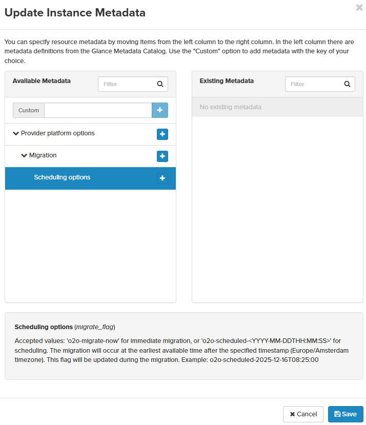 When your instance is flagged for migration, additional metadata is added to your instance named o2o-scheduled-YYYY-MM-DDTHH:MM:SS. You can schedule the migration by changing the date / time (times are in the europe/amsterdam timezone!) to your preference. A date / time in the past will start a migration as soon as a migration slot is available (normally within a minute). Alternatively you can set metadata o2o-migrate-now on the metadata key migrate_flag.