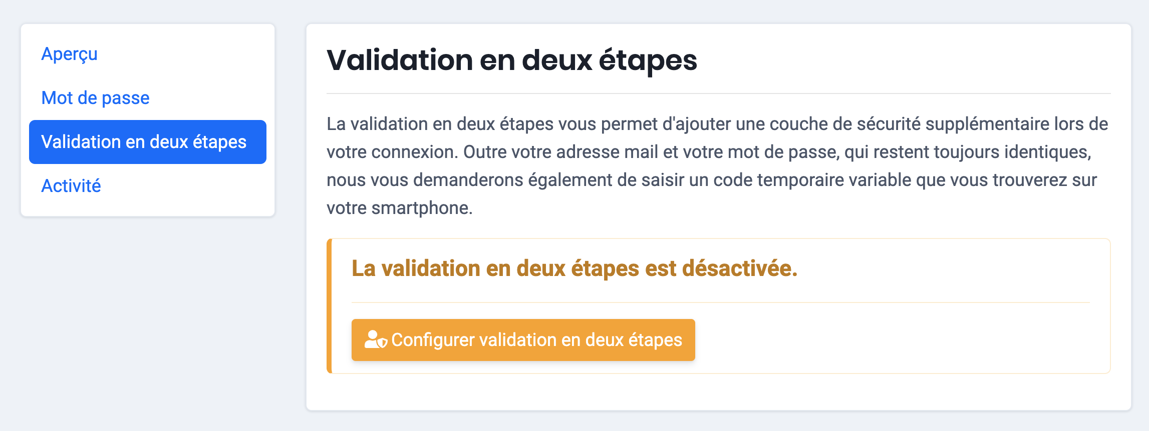 2. Dans le menu de gauche, cliquez sur « Validation en deux étapes ».