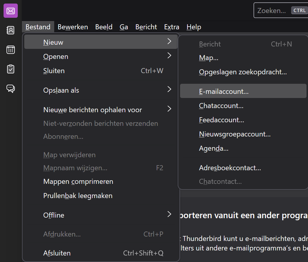 - Ga naar “Bestand” > “Nieuw” > “E-mailaccount” (zie screenshot)