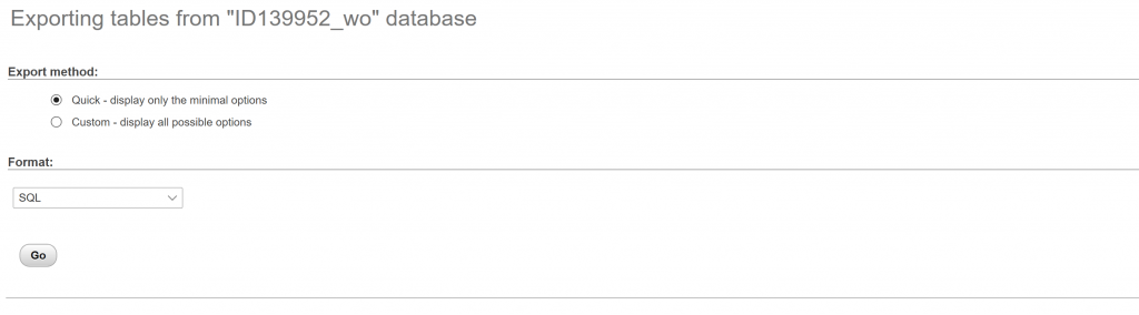 - De exportmethode (“Snel”) en het exportformaat (“SQL”) staan standaard goed ingesteld normaliter (zie afbeelding).